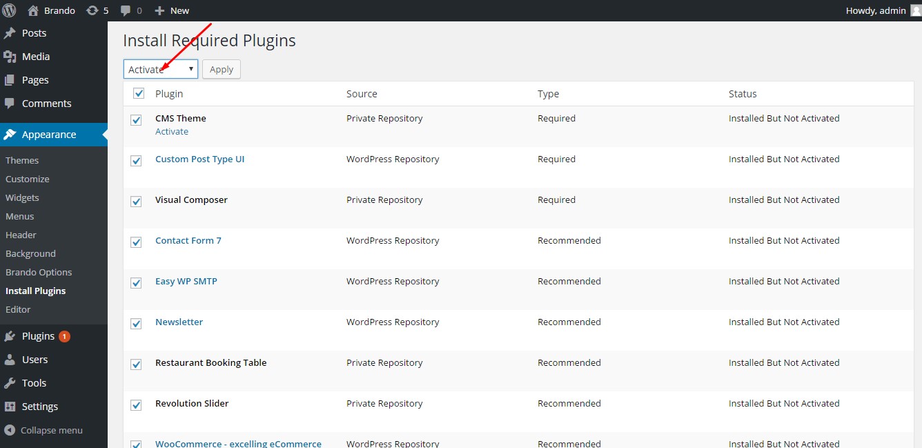 Step 1: After activating the theme a notice should appear on the top of the screen, click on Begin installing plugins